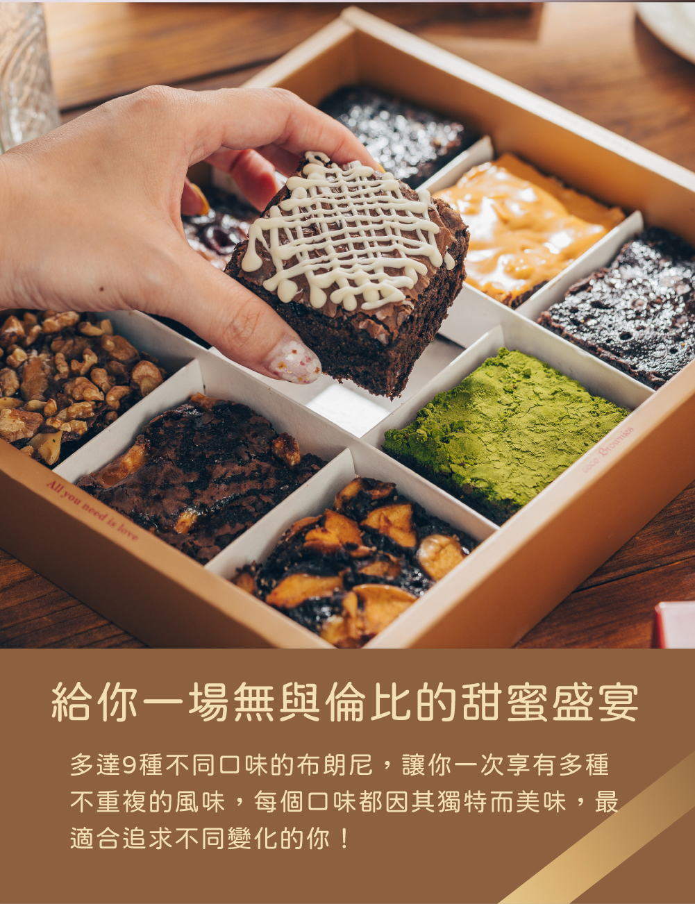 布朗尼 : 肉桂蘋果/焦糖海鹽/核桃堅果/抹茶/皇家伯爵茶/白蘭地櫻桃乳酪/茉莉花茶/花生顆粒醬/棉花糖,各一片
