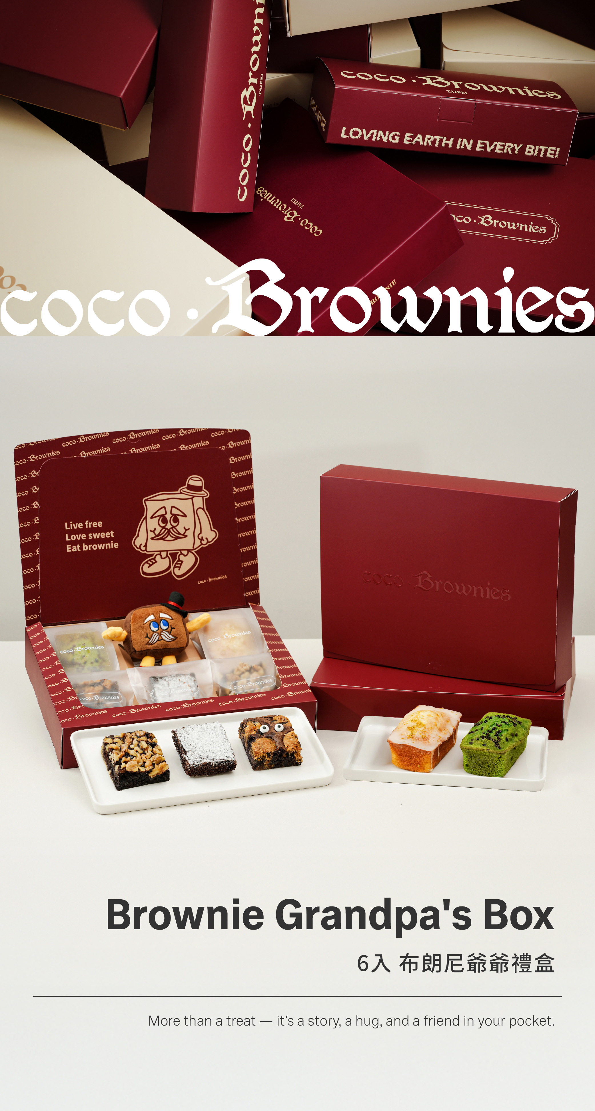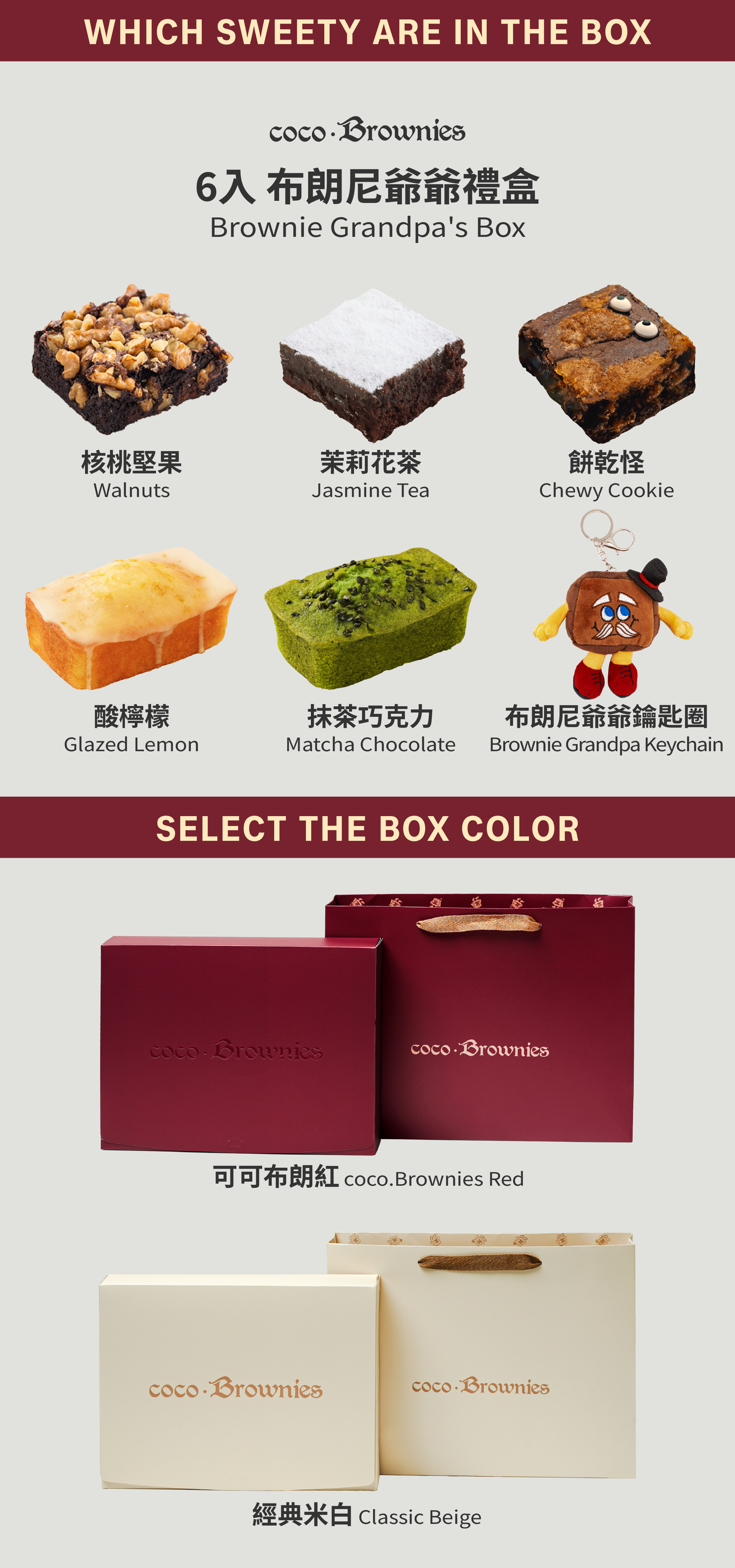 內容口味:6入 (磅蛋糕2入+布朗尼3入+布朗尼爺爺鑰匙圈1入,固定口味)