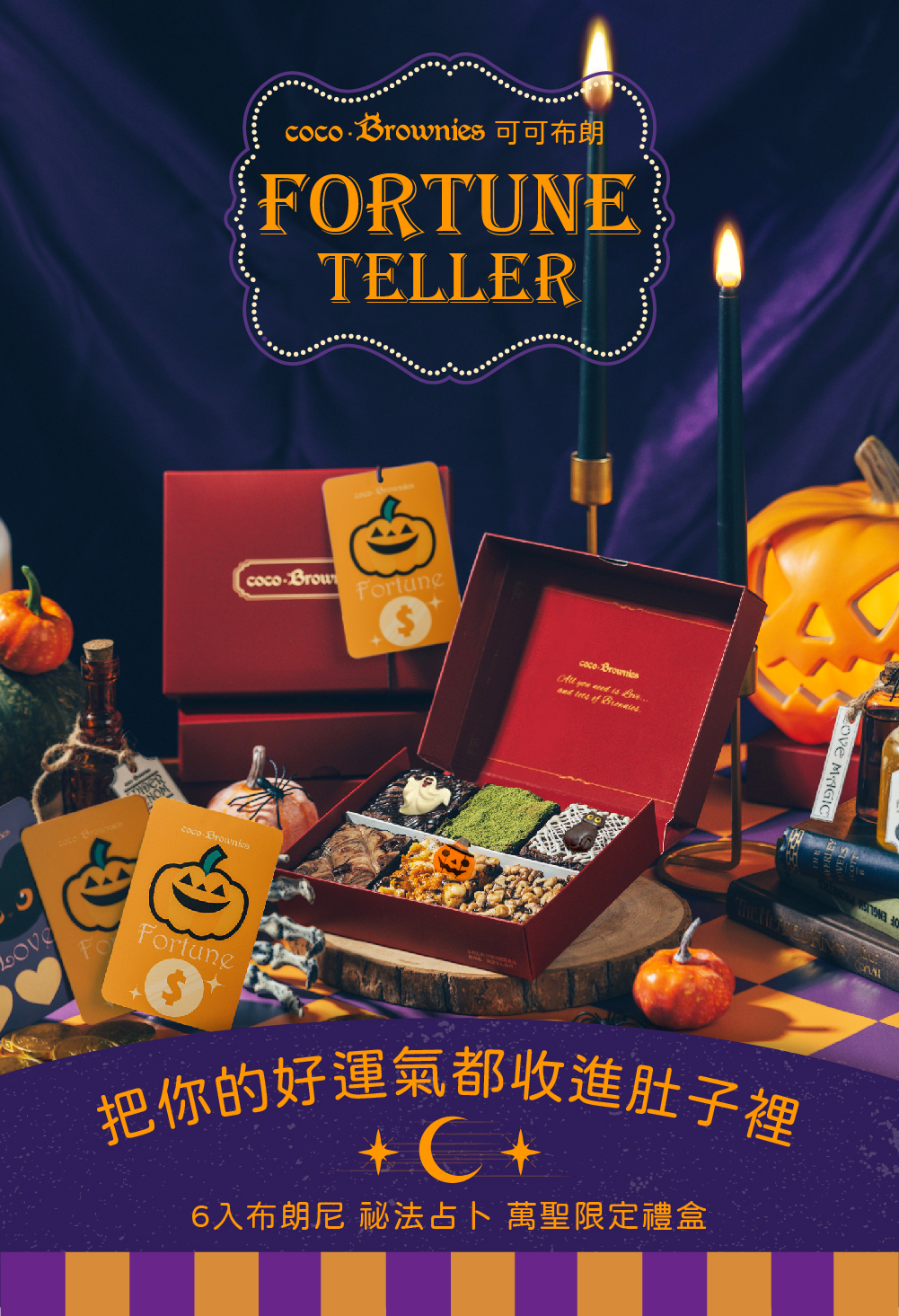 開盒啟動你的強運!把好運都收進肚子裡,萬聖限定新品「6入布朗尼祕法占卜禮盒」強運登場。出貨附上一張「萬聖限定南瓜造型塔羅吊牌」,為你卜一卜未來好運落在哪!