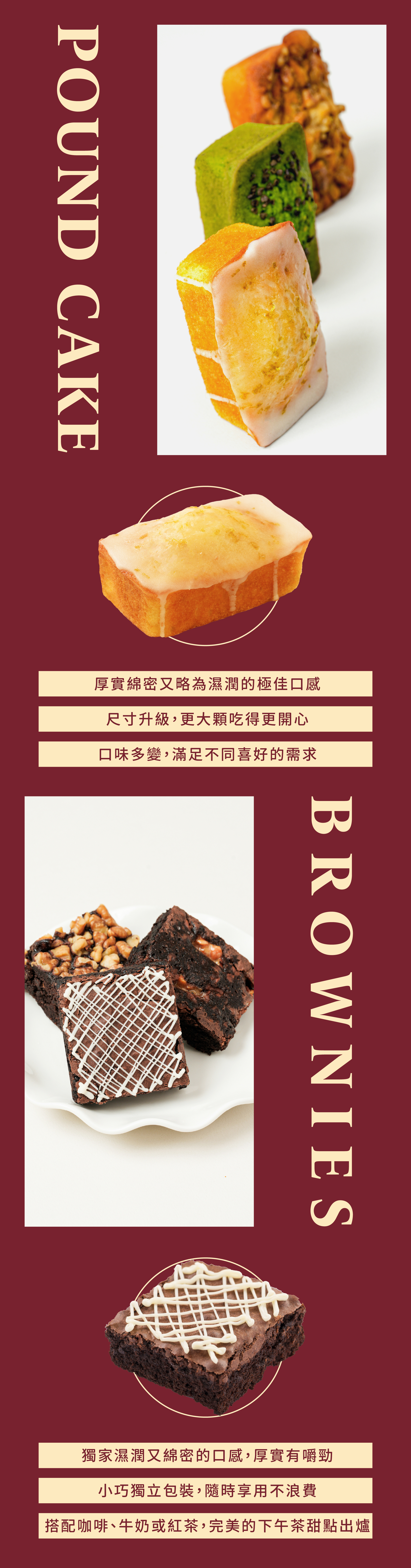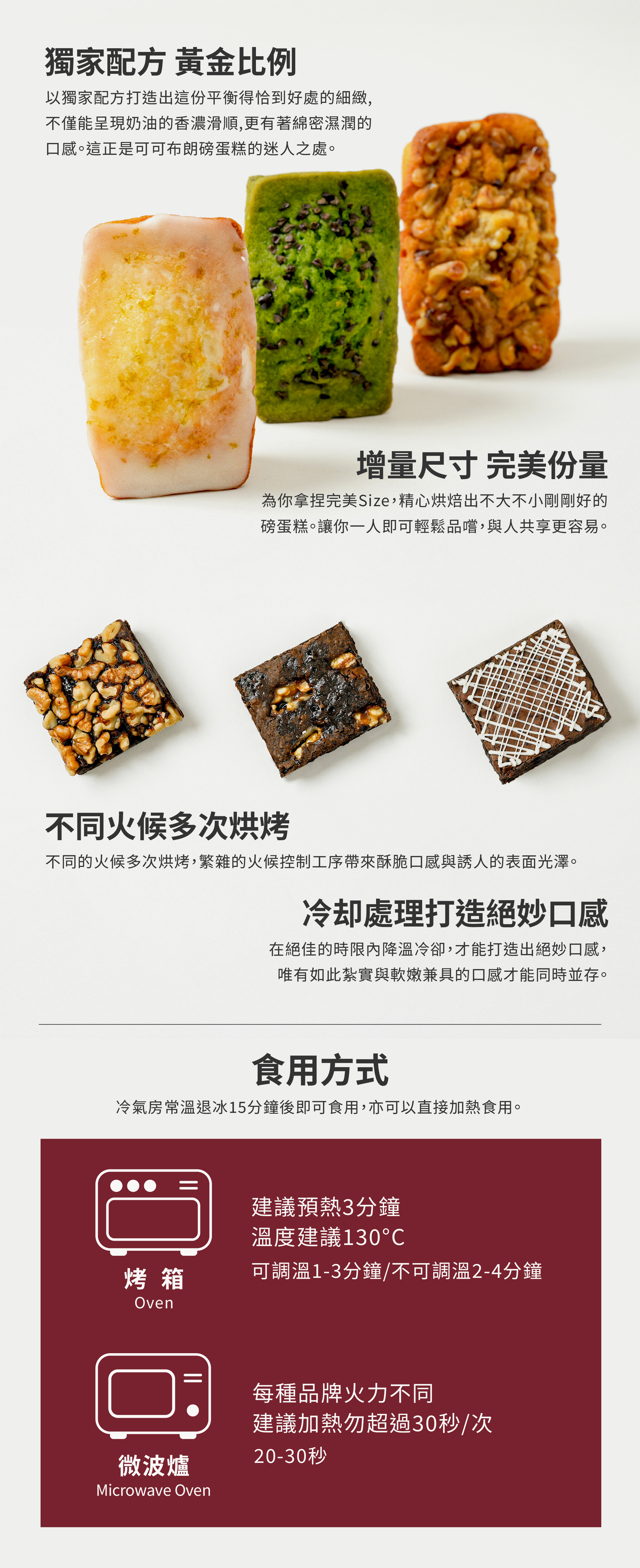淨重:磅蛋糕 100g±5%/片、布朗尼 60g±5%/片