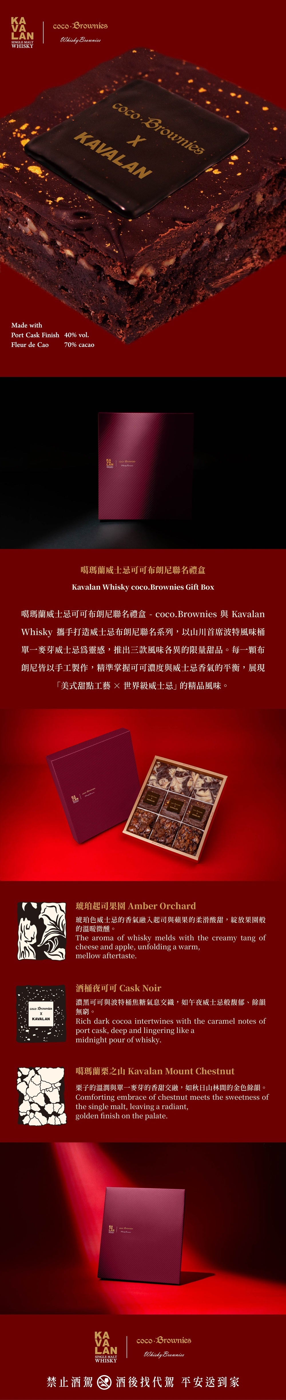 coco.Brownies 與 Kavalan Whisky 攜手打造威士忌布朗尼聯名系列,以山川首席波特風味桶單一麥芽威士忌為靈感,推出三款風味各異的限量甜品,展現「美式甜點工藝 × 世界級威士忌」的精品風味。